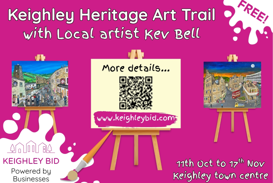 Keighley Heritage Art Trail launches on Saturday, 11th October and runs until 17th November. The trail features vibrant paintings of Keighley architecture by beloved local artist Kev Bell. The paintings are displayed throughout Keighley town centre either in or near the historic buildings that inspired them.